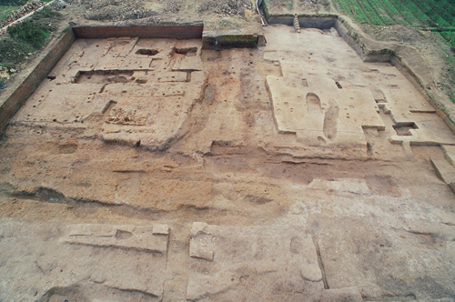 保存较好,规格较高,规模较大的有三座屈家岭文化时期的房址,集中的分布在城址中心附近。它们均筑有四面坡下的黄土台基,而后再在台基面上挖基槽,修整居住面,然后起建。平面形状为方形或长方形。一座是小型排房,中间为走廊,两边对称分布小房间,单个居室面积仅3~5平方米,表明已有分室而居的现象;一座是套房,前为餐厅,后为有四个连体灶的厨房;另一座是大型殿堂式建筑,室内面积达到63平方米,可能是祖庙。房屋因使用功能不同而出现结构上的分化,是这一时期房屋建筑的一大特点。代表了屈家岭文化时期的建筑过程,为我们提供了屈家岭文化早期聚落的珍贵资料。