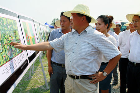 文化部副部长、国家文物局局长励小捷(前一)听取澧县宣传部副部长、城头山古文化遗址管理处主任刘勇(后左一)介绍城头山国家考古遗址公园建设规划情况。