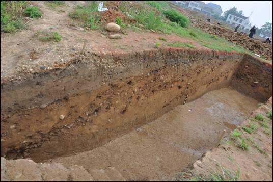 庙坟上台地位于城头山遗址西南部,遗址地表现存屈家岭文化时期护城河之外,是一个比周围地面高出1.5-1.8米的凸台。台地现状南北长62米,东西宽57米,形状不规则,总面积约3200平方米。经考古调查与钻探,确认该台地之主体为人工堆筑而成。2013年12月和2014年3至5月,我们对该台地进行了两次考古发掘,在现存台地中部布设5×5平方米探方15个,另在台地东、南和北缘布设不同规格探沟4条,实际总发掘面积375平方米。